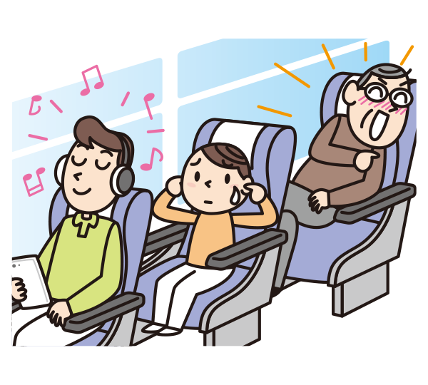 車内では大声や大きな音を出さないでください。ヘッドホンやイヤホンから音もれしないようお願いします。