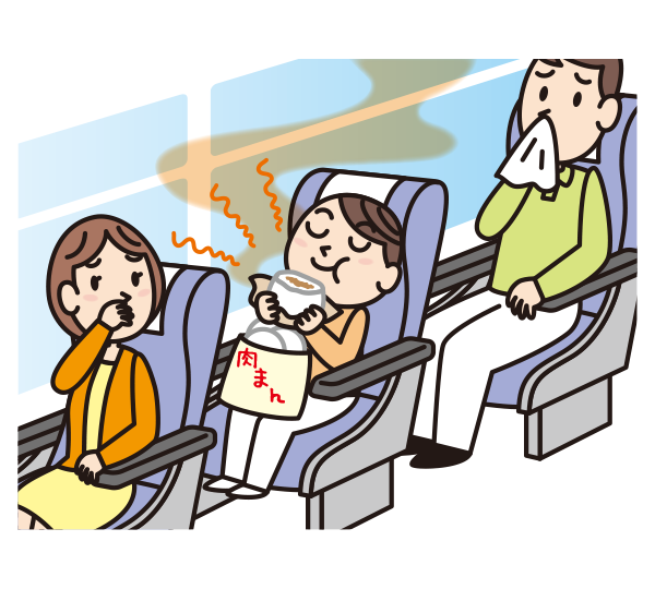 車内やバス停での飲食はご遠慮ください。においの強い食べ物、飲み物の車内への持ち込みはご遠慮ください。