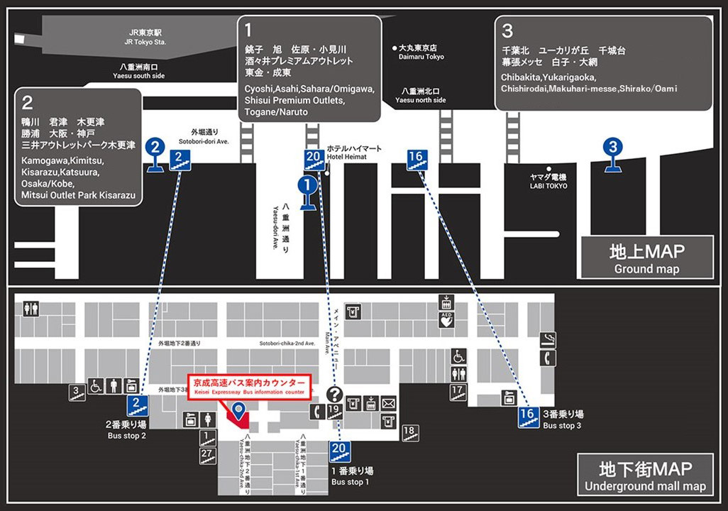「東京駅 京成高速バス案内カウンター」は、京成高速バス各のりば(1〜3番)へのアクセスも良好な東京駅直結の「八重洲地下街」に開設した総合案内所です。