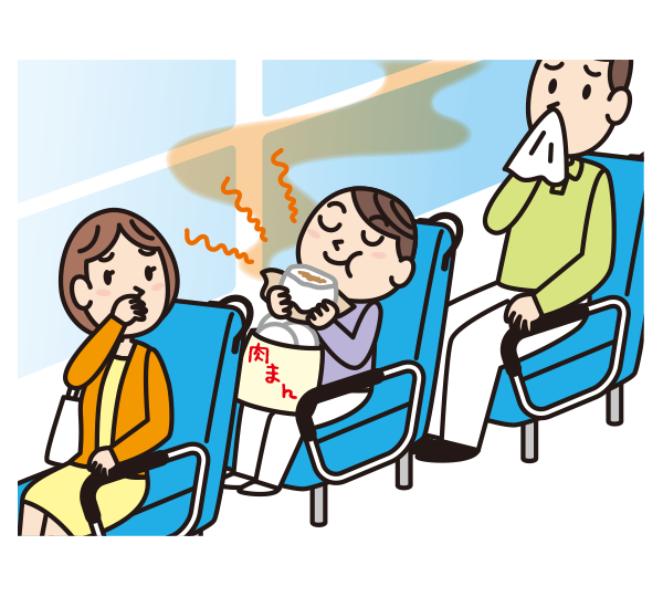車内やバス停での飲食はご遠慮ください。においの強い食べ物、飲み物の車内への持ち込みはご遠慮ください。