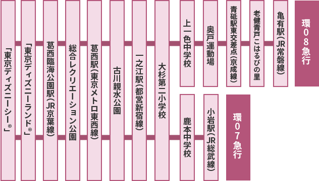 一之江駅(都営新宿線)・葛西駅(東京メトロ東西線)・葛西臨海公園駅(JR京葉線)を経由して